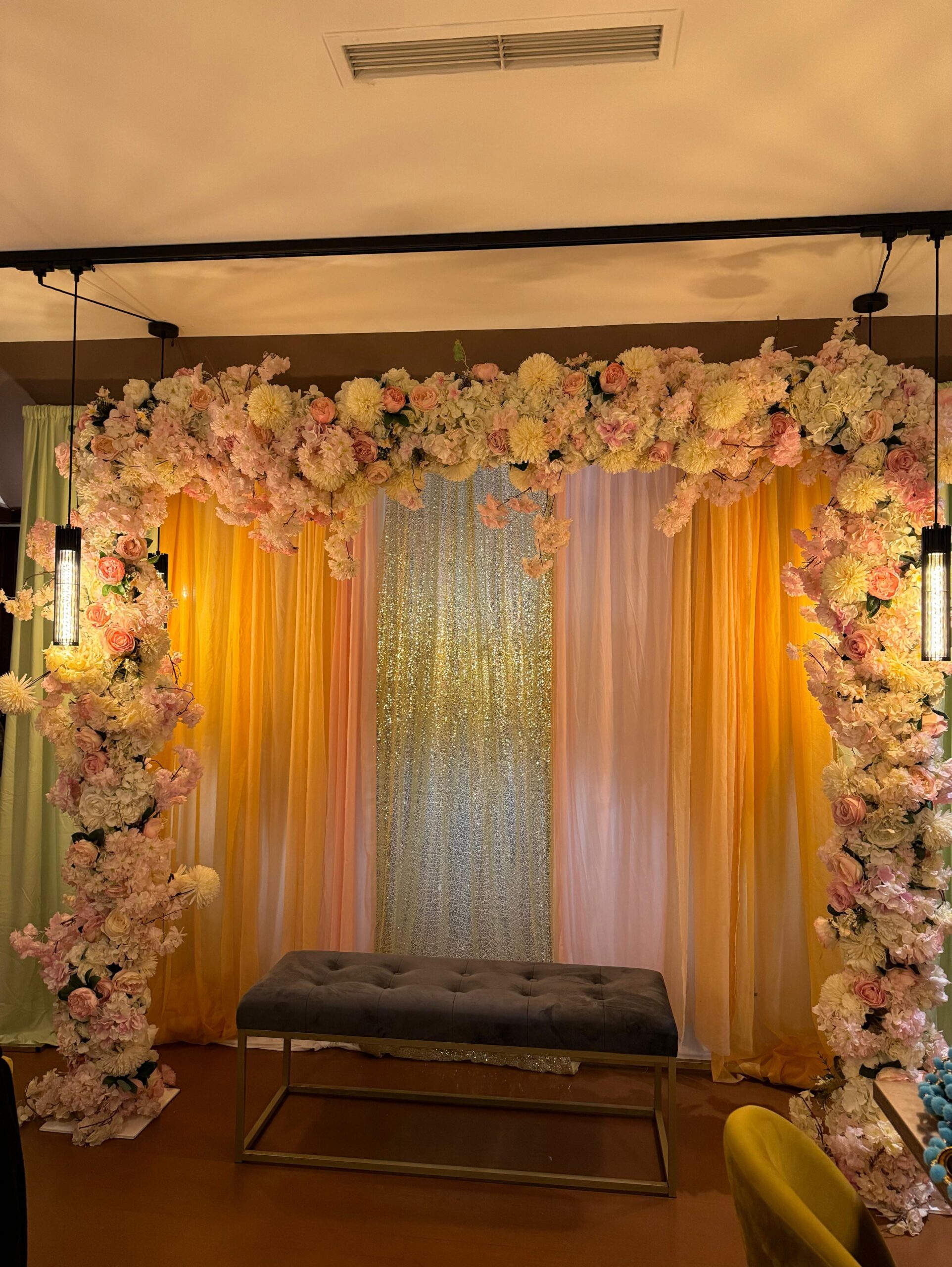 Haldi und Mehndi leben von Farben und Freude. Wir gestalten mit bunten Stoffen, floralen Mustern und kreativen Sitzbereichen. Marigold-Girlanden, farbenfrohe Drapierungen und bunte Kissen sorgen für ein lebendiges Ambiente. So wird die Zeremonie festlich und unvergesslich.