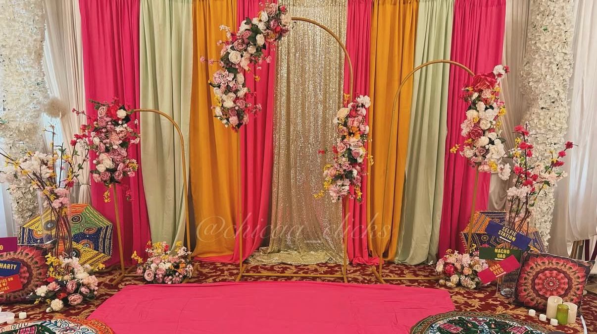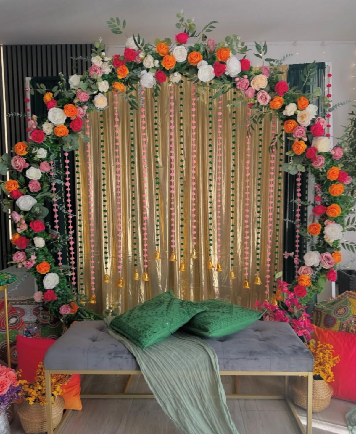 Für deine Haldi- oder Mehndi-Zeremonie bieten wir eine große Auswahl an farbenfrohen Stoffen, Mustern und stilvollen Dekoelementen, die perfekt zur festlichen Stimmung passen. Ob leuchtende Gelbtöne für Haldi oder bunte Akzente für Mehndi, wir gestalten mit Liebe zum Detail individuelle Konzepte, die Tradition und modernen Stil vereinen.